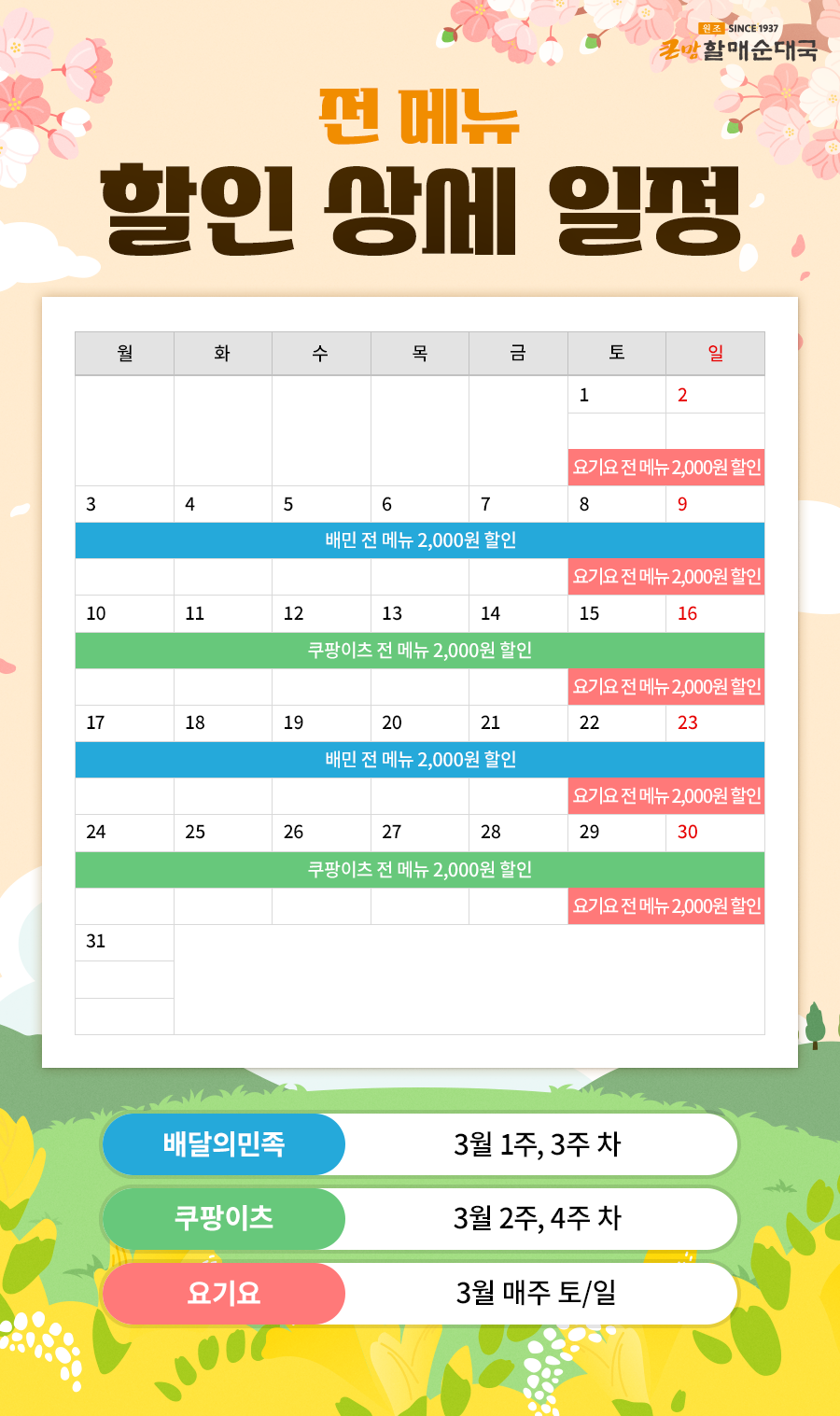 [3월 배달앱 할인 프로모션] 한 달간 전 메뉴 최대 2천 원 할인