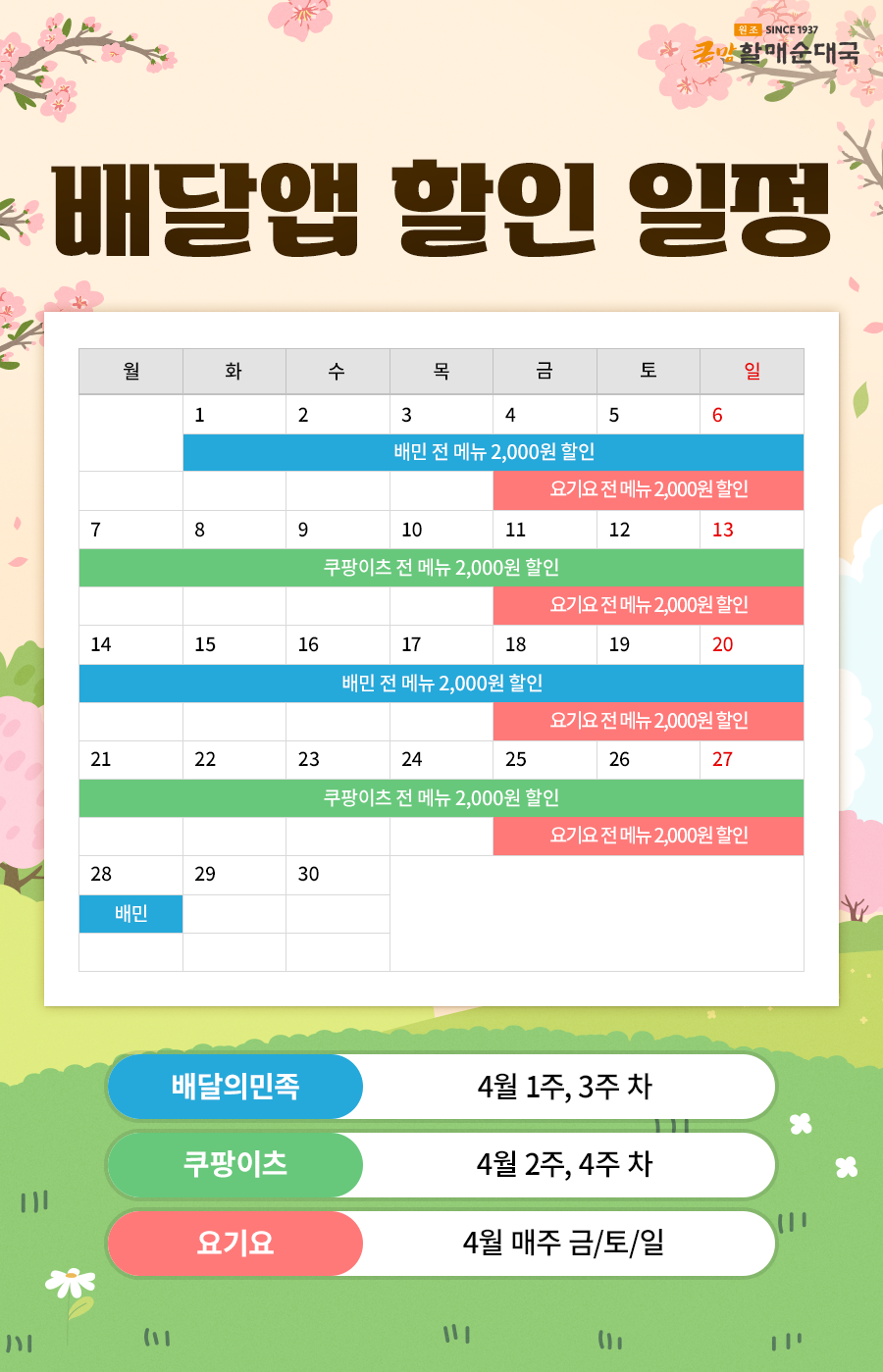[4월 배달앱 할인 프로모션] 한 달간 전 메뉴 최대 2천 원 할인