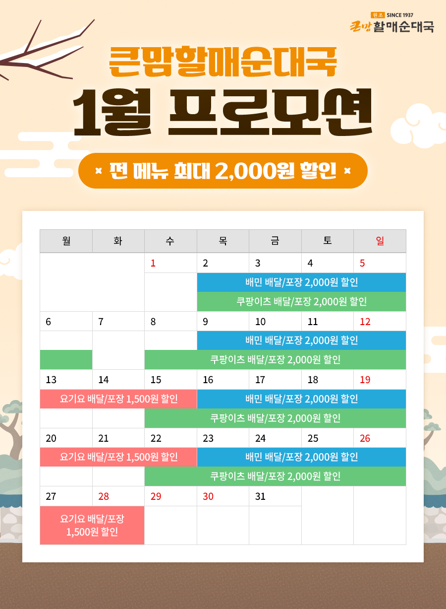[1월 배달앱 할인 프로모션] 한 달간 전 메뉴 최대 2천 원 할인